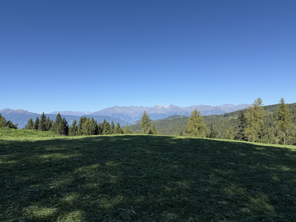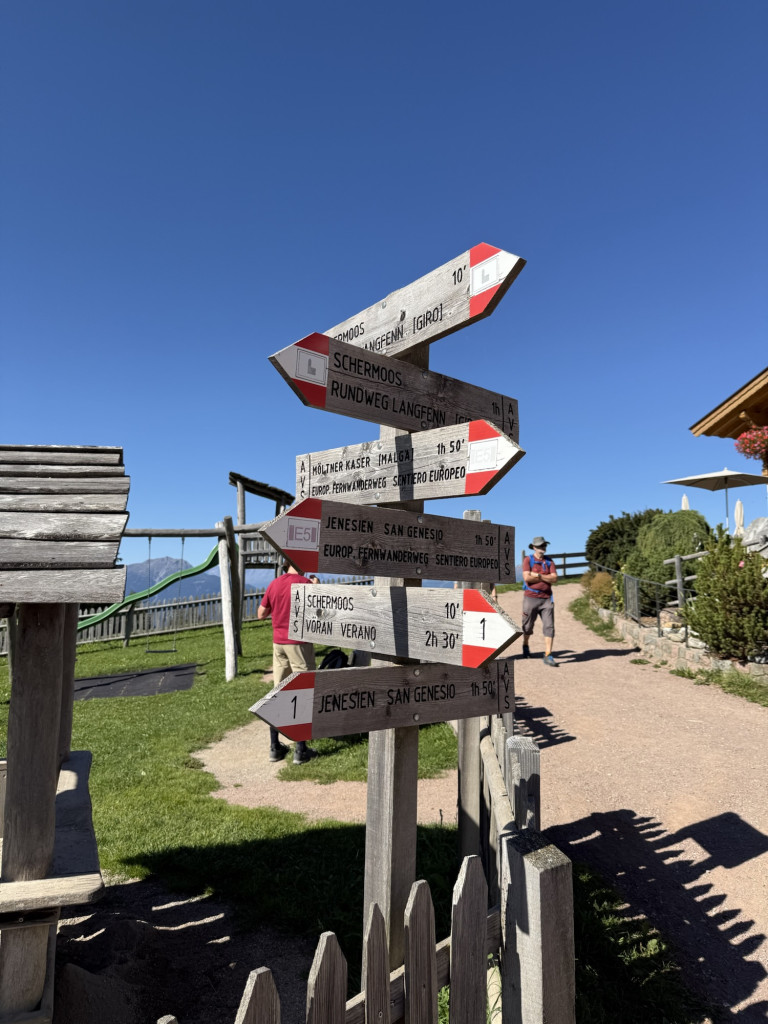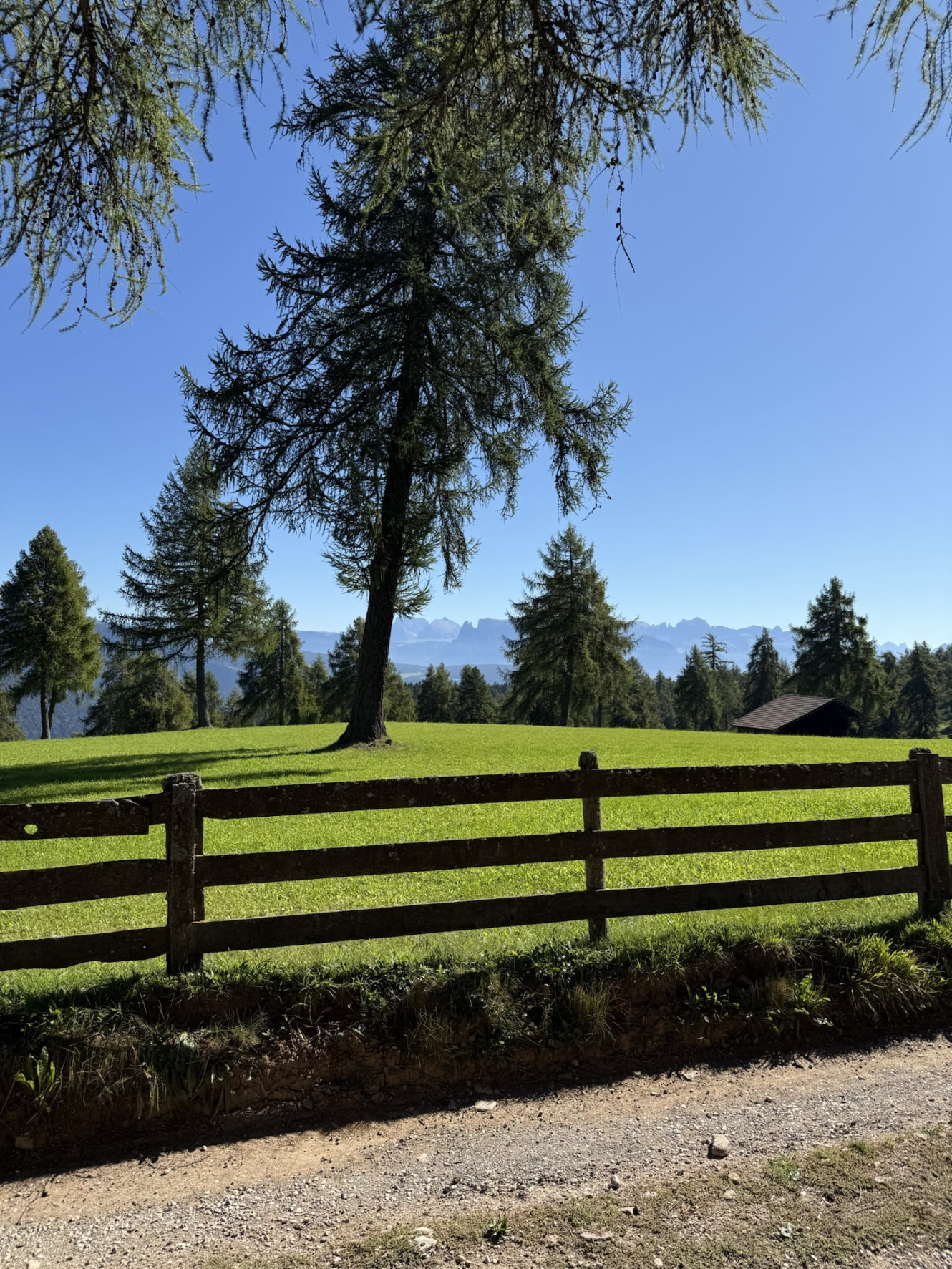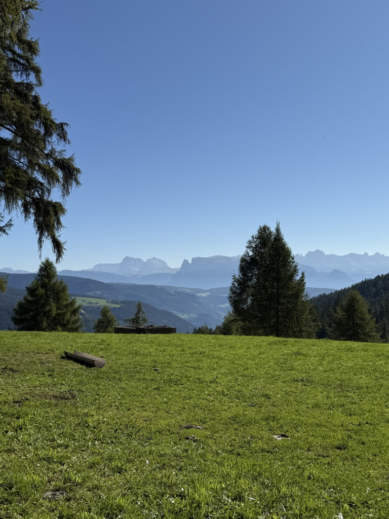 Vom Salten hier oben genießen wir einen wunderschönen 360-Grad-Rundumblick. Auf der einen Seite liegen die Dolomiten mit Sella, Langkofel, Plattkofel, Schlern und Rosengarten, auf der anderen Seite schweift der Blick über die sanften Hügel des Etschtals, hinüber zum Ortler- und Texelmassiv, den Sarntaler Alpen und bis ins Meraner Land. Bei klarer Sicht erkennt man sogar die Ötztaler Alpen.