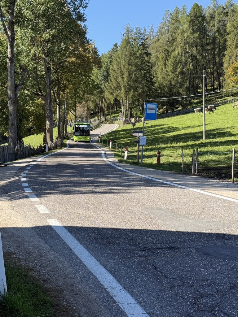 Dank der Südtirol Gästekarte steigen wir kostenlos in den Bus, der uns bequem zum Wanderparkplatz Schermoosattel bringt.