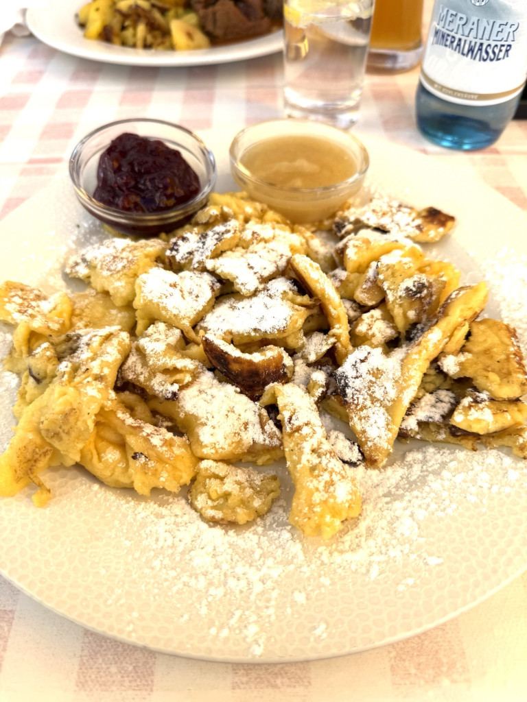 Und als Belohnung nach dem vielen Wandern und der frischen Bergluft gönnen wir uns eine süße Südtiroler Köstlichkeit: luftigen Kaiserschmarrn, frisch aus der Pfanne, mit Staubzucker bestäubt und mit Zwetschgenröster serviert. Der perfekte Abschluss eines Wandertages auf dem Salten!