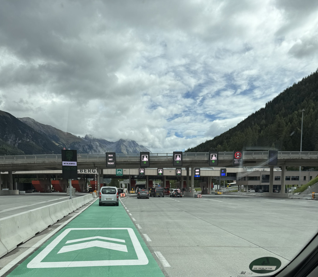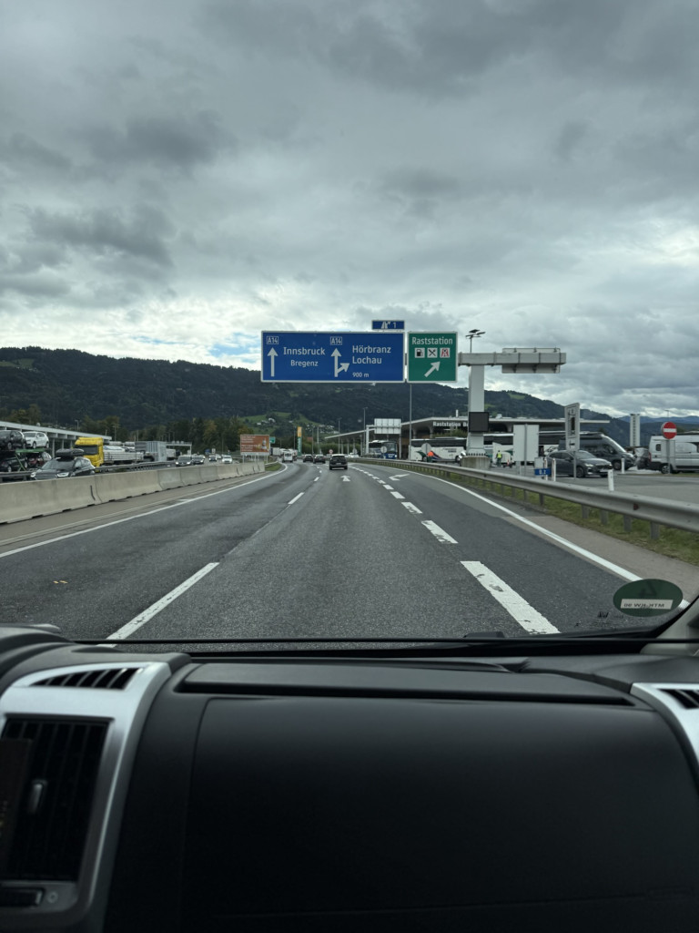 Der dritte Reisetag beginnt grau und nass: Bei Nieselregen und tief hängenden Wolken brechen wir in Richtung Südtirol auf. Unser erstes Etappenziel ist Bregenz – dort wartet auch schon der erste von mehreren Tunneln, die wir heute durchqueren werden. Zum Glück haben wir unsere Autobahnvignette bereits online gebucht.