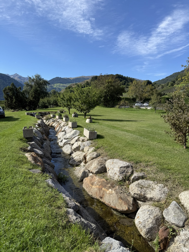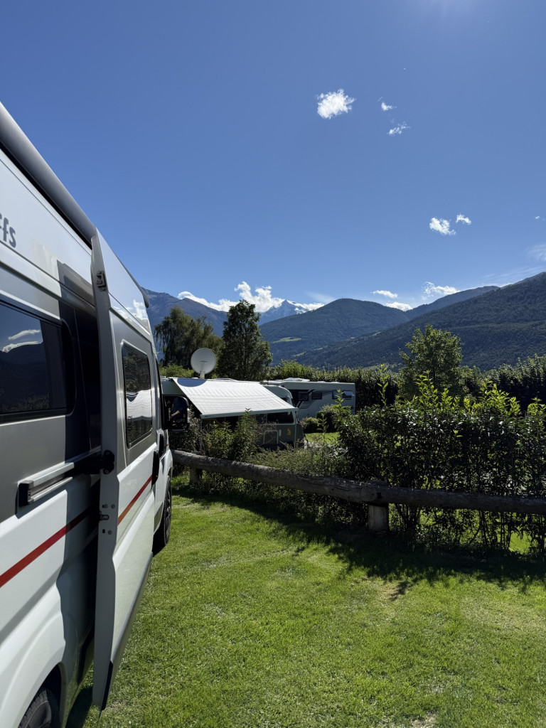 Unser Stellplatz entpuppt sich als echtes Schmuckstück: terrassenförmig angelegt, mit freiem Blick auf den Ortler. Den obligatorischen Aufbau verschieben wir kurzerhand – der Hunger ist größer. Direkt neben dem Campingplatz liegt eine kleine Jausenstation mit Imbiss.