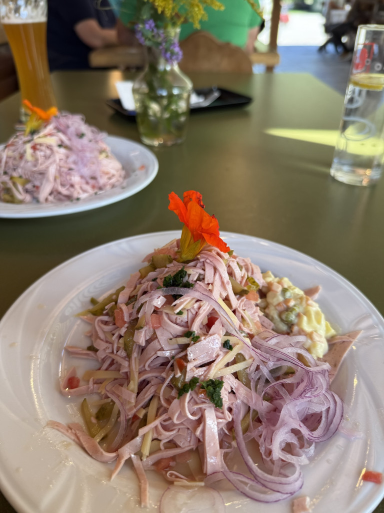 Wir bestellen einen Wurstsalat – es soll ja nur eine Kleinigkeit sein. Doch anscheinend wirken wir sehr hungrig, denn als „Beilage“ gibt es für jeden noch eine Portion Pommes und natürlich Vinschgauer Brot. Und weil wir offenbar noch immer ausgehungert aussehen, bringt er uns zum Abschluss sogar ein Stück Erdbeerkuchen. Mit seinen witzigen Sprüchen wird das Ganze zu einer kleinen, sehr herzlichen Showeinlage.